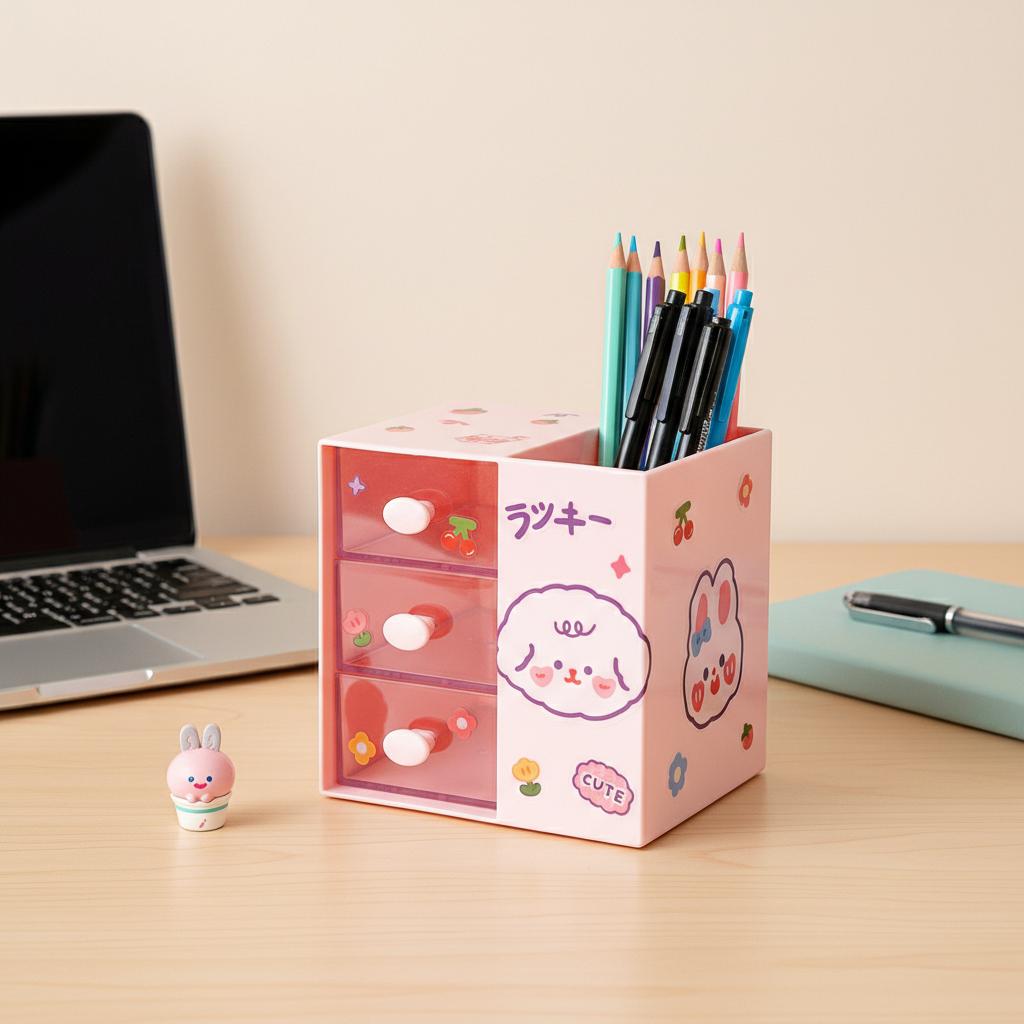 Mignon Organisateur de Pot à Crayons Dessin Animé pour Filles Étudiantes Bureau Boîte de Rangement Multifonctionnelle avec Compartiments pour Papeterie