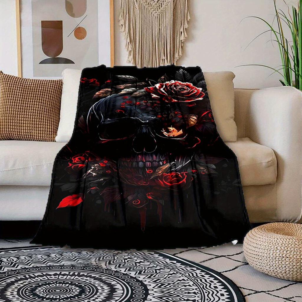 1pc Rose And Skull Print Blanket, Flannel Blanket, Soft Warm Throw Blanket Nap Blanket For Couch Sofa Office Bed Camping Travel
