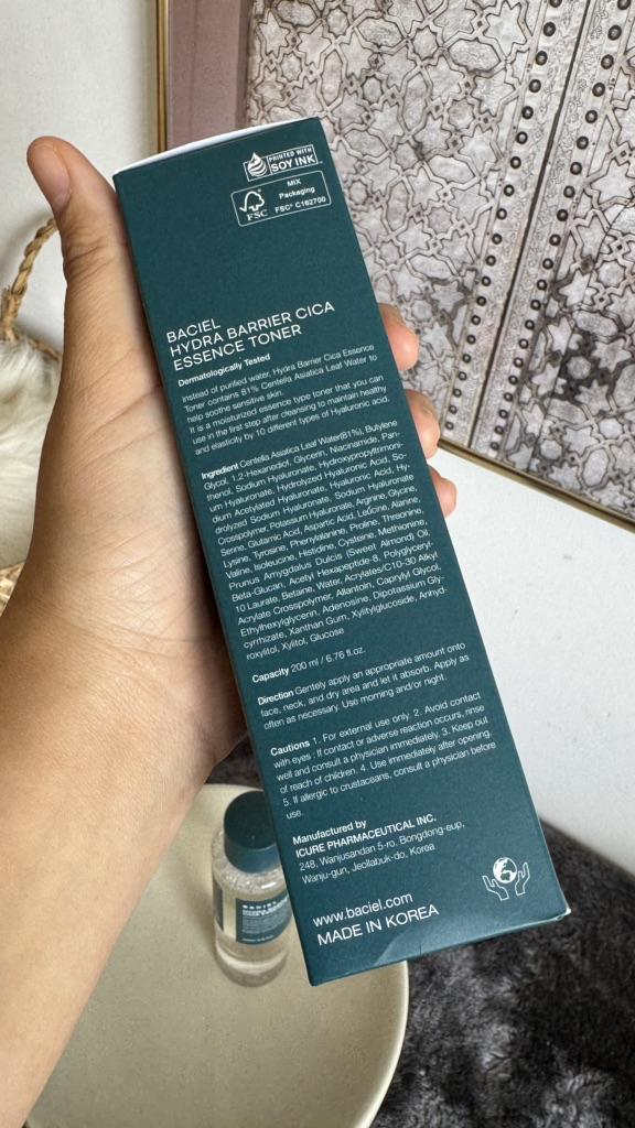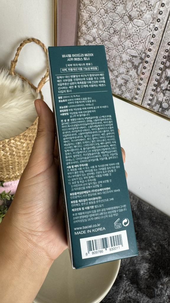 BACIEL Hydra Barrier CICA toninė esencija 💚💚💚 Toniką laikau labai svarbiu savo odos priežiūros žingsniu ir tai nuostabu mano virš 40 metų amžiaus odai. Tiesą sakant, tonikas skirtas giliam drėkinimui ir kompleksiniam veido patempimui: tonikas naudingas raukšlėms išlyginti, elastingumui didinti, blankumui panaikinti ir odai suteikti sveiką išvaizdą.🥰🥰🥰 PAPILDOMAS HIDRATAVIMAS: Šiame toniku yra 81% Centella Asiatica lapų vandens, beta gliukano ir 10 rūšių hialurono rūgšties, nuo itin mažos molekulinės masės iki didelės molekulinės masės. ŠVIETINANTIS + NUO RAUKŠČIŲ: tai šviesinantis ir nuo raukšlių mažinantis produktas, nes jame yra niacinamido ir adenozino. Jame taip pat yra pantenolio, vitamino B5 komponento, kuris padės jums tobulėti link sveikos, gražios odos. Tonikas turi skaidrią, nelipnią formulę, kuri greitai įsigeria į odą. Tonikas suteikia veidui patogų gaivumo ir drėkinimo pojūtį. Naudojimas: tepkite ant nuvalytos veido, kaklo ir dekoltė odos lengvais judesiais arba masažuokite vatos diskeliu. Esu visiškai patenkinta šiuo produktu ir rekomenduoju ✅✅✅