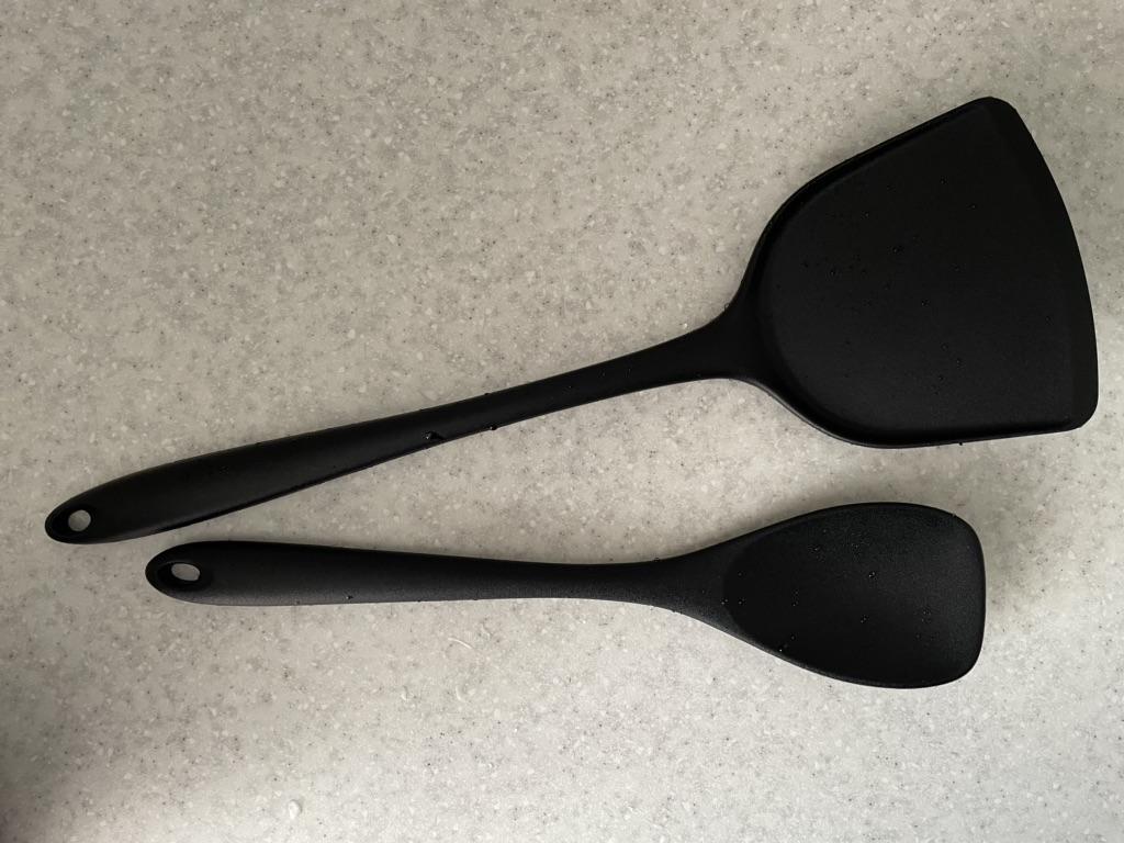 Spatelen er svart, materialet er silikon, den smelter ikke ved steking
