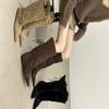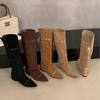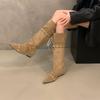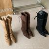 Cowhide retro inner height-increasing pointed head high tube boots, new string-strap pleated thin boots, folded and two stacked boots
